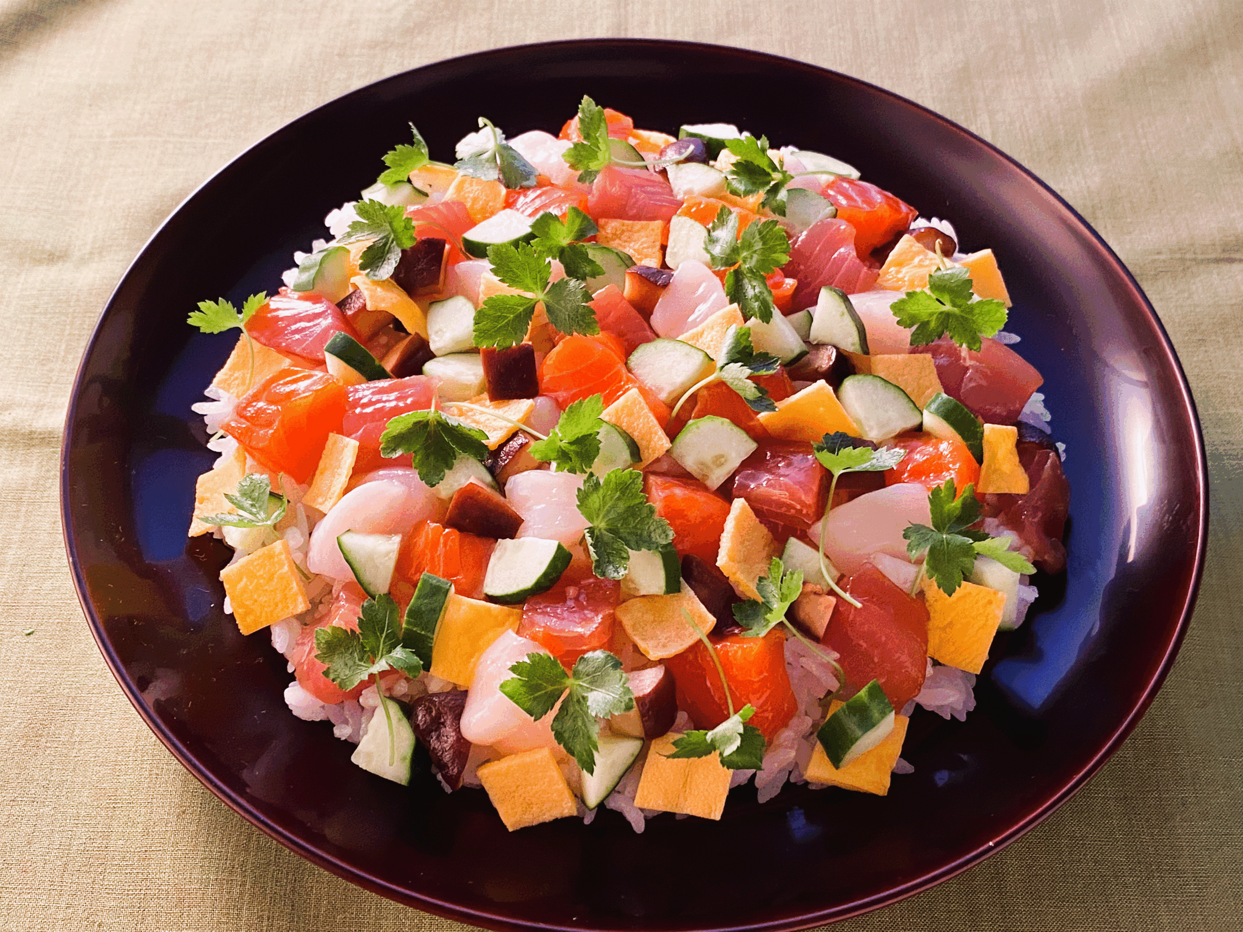5) すしめしに2)、3)をのせ、1)、4)をかざる。